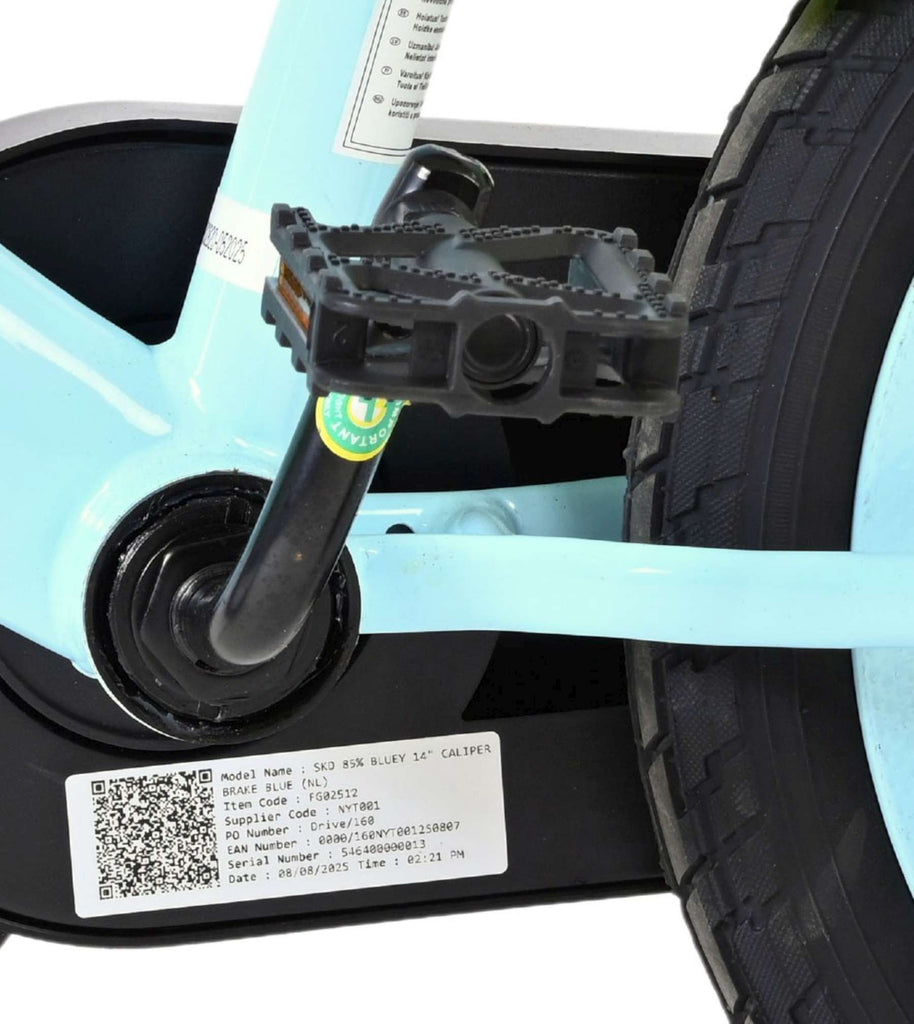 Voor jonge Bluey-fans die klaar zijn voor hun eigen fietsavonturen, is er de 14 inch Bluey kinderfiets van Volare! Deze vrolijke lichtblauwe fiets met neon groene spatborden springt meteen in het oog en is volledig in stijl van de populaire tv-heldin Bluey. Met kleurrijke prints op het frame én een stoer voorplaatje met Bluey’s gezicht is elke rit een feest vol herkenning en plezier.