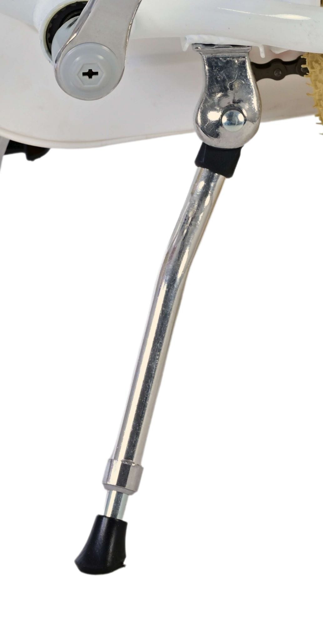 Veiligheid staat voorop: de fiets heeft verlichting voor zichtbaarheid in het donker en reflectoren in de wielen die extra opvallen. De stevige standaard zorgt ervoor dat de fiets altijd veilig kan worden neergezet.