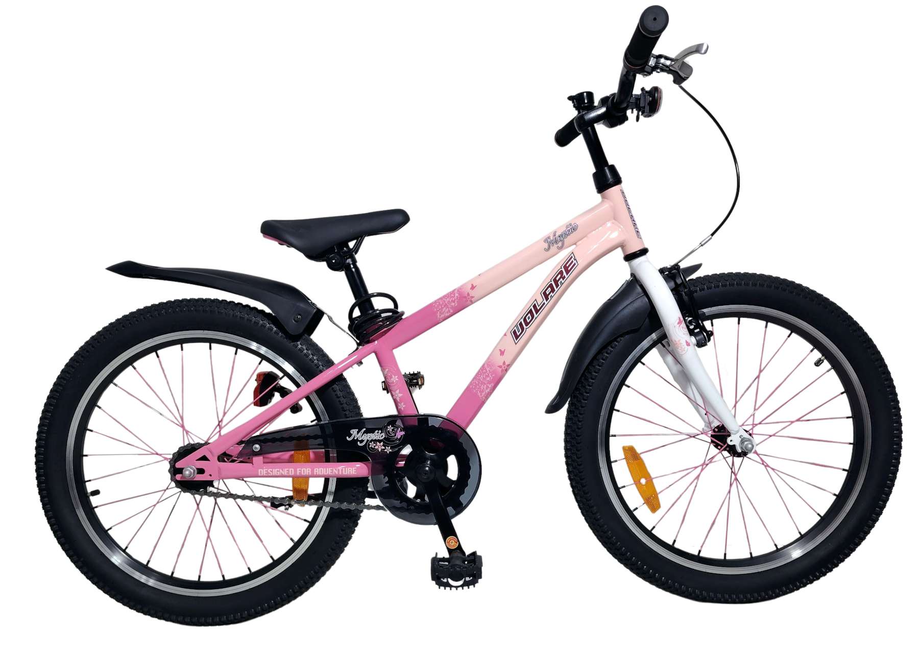 Dankzij de verlichting aan de voor- en achterkant is je kind ook goed zichtbaar in het donker of bij slecht weer. Het sportieve karakter van de Volare Mystic wordt versterkt door de roze spaken, die de fiets een unieke en opvallende uitstraling geven. Voor extra gemak en veiligheid is de fiets voorzien van een slot en een duidelijke bel.