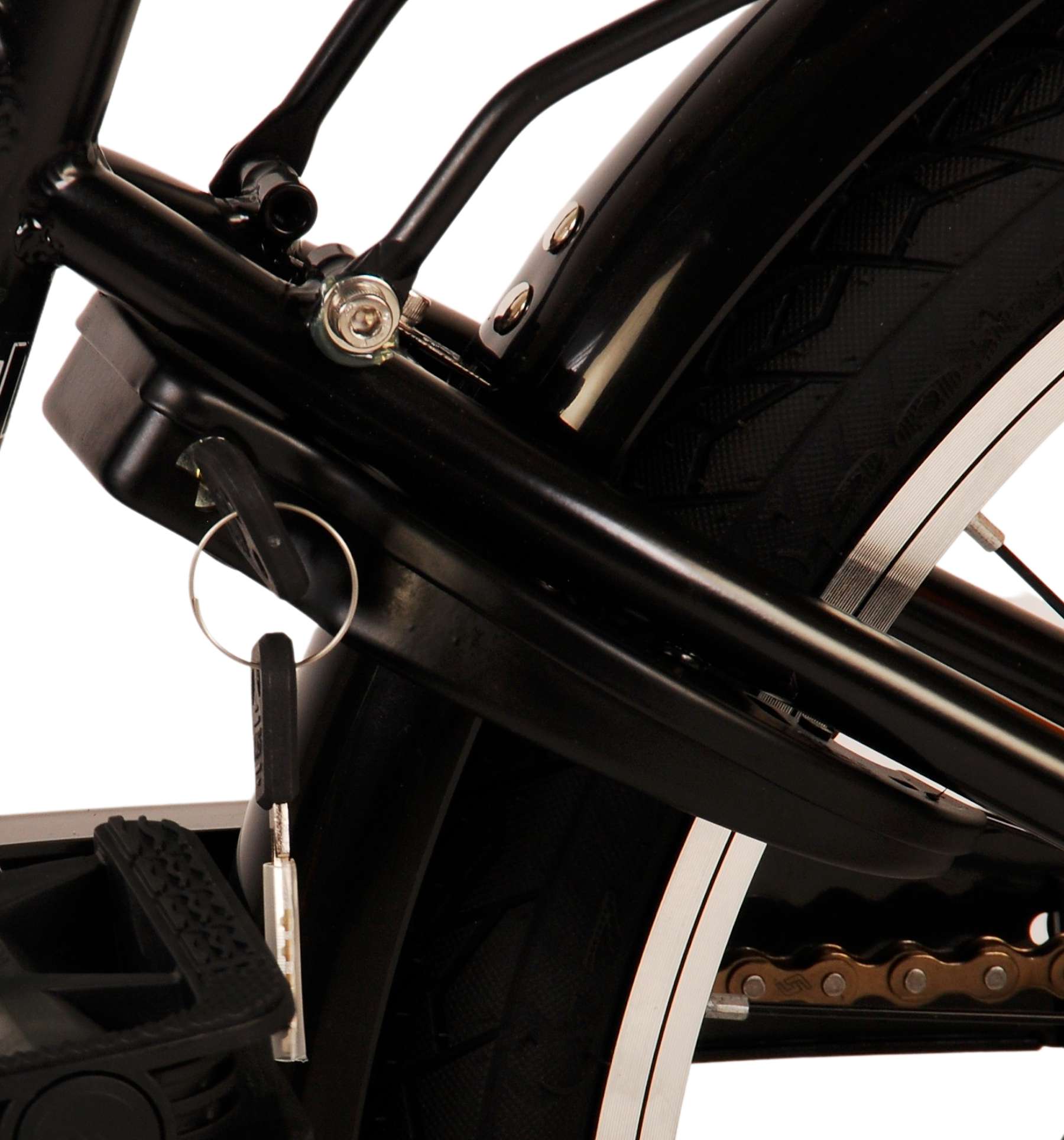 Veiligheid staat voorop! Daarom heeft deze gave fiets een handrem en terugtraprem en verlichting op batterij voor en achter. Daarnaast heeft de fiets een leuke bel en reflectoren in de wielen. Ook aan het comfort is gedacht. De mooie zwarte Volare fiets met groene accenten heeft een luxe zacht zadel en extra zachte handvaten, een handige achterdrager, en een stevig frame dat wel tegen een stootje kan. Verder heeft de fiets een standaard zodat hij netjes blijft staan en een sterk slot. Om zo lang mogelijk van de fiets te kunnen genieten heeft deze een extra lange zadelpen waardoor de fiets nóg langer met het kind meegroeit en ook het stuur is in hoogte verstelbaar.