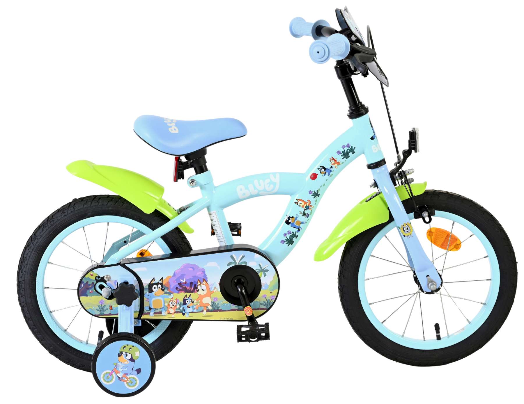 Voor kleine avonturiers is er de 14 inch Bluey kinderfiets van Volare – de ideale fiets voor kinderen die klaar zijn om zelfverzekerd de wereld te verkennen. De vrolijke lichtblauwe kleur in combinatie met de opvallende neon groene spatborden geeft deze fiets een speelse en frisse uitstraling, perfect passend bij de energieke stijl van Bluey.