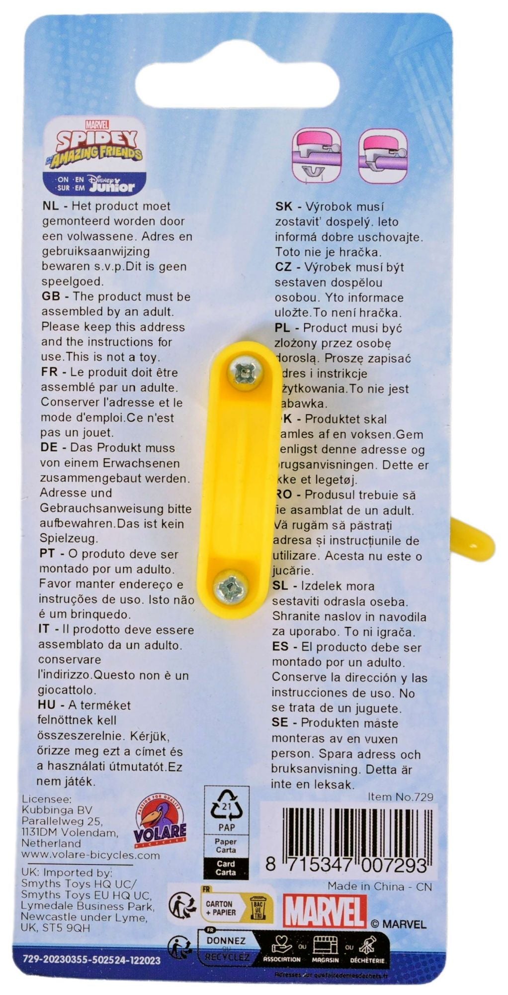 Deze coole Marvel Spidey fietsbel is makkelijk te bevestigen aan de fiets van iedere Spidey en his Amazing Friends-fan! Laat je fietsbel klinken, zodat iedereen weet dat je de hoek om komt. Ring-ring!