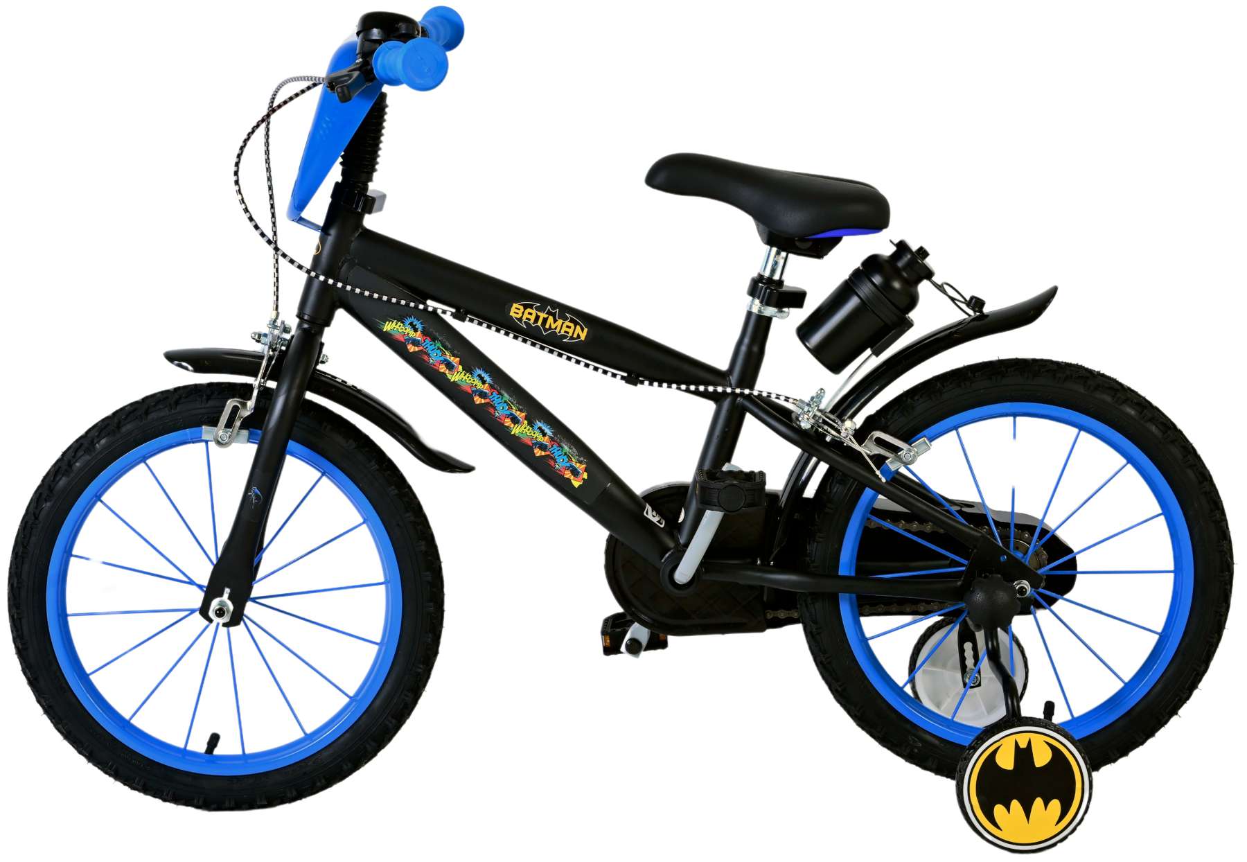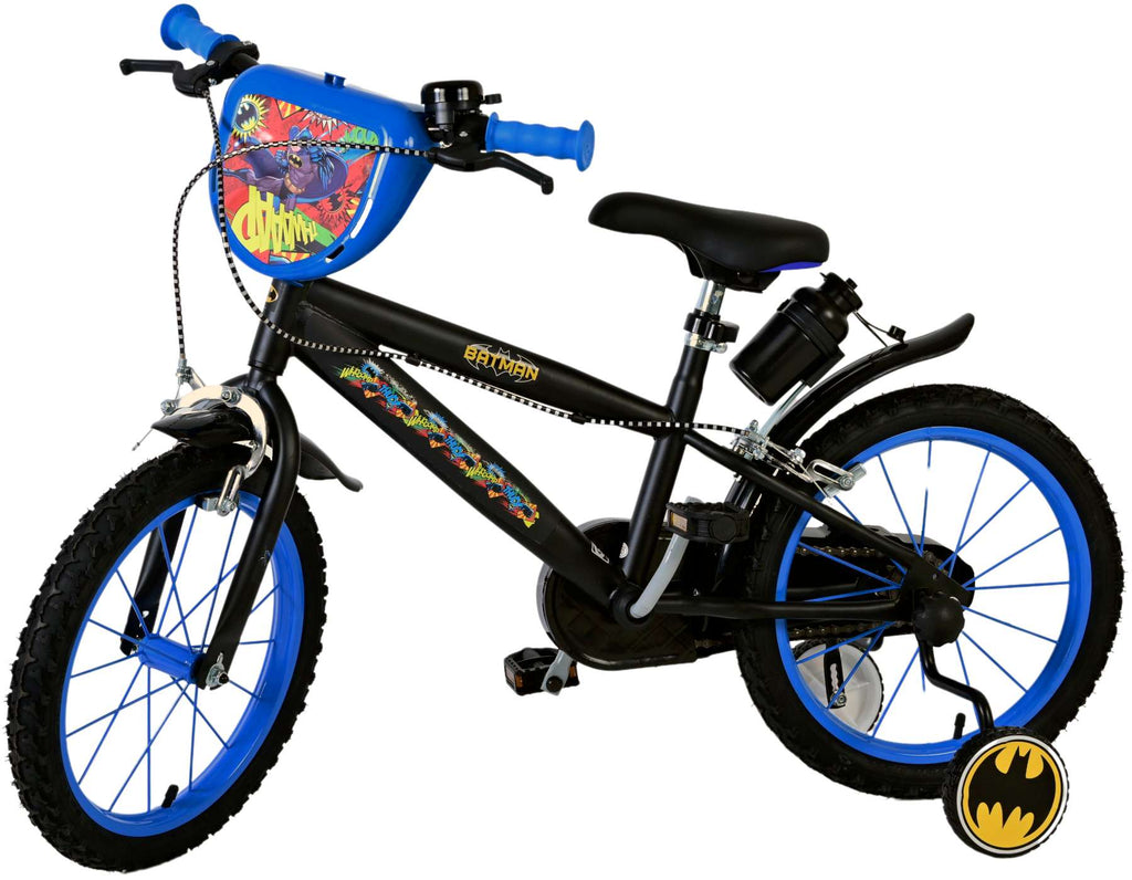 Veiligheid staat voorop! Daarom heeft deze gave fiets geen terugtraprem maar twee handremmen, een gesloten kettingkast en afneembare zijwieltjes. Maar ook aan het comfort is gedacht! De mooie zwarte Batman fiets met blauwe accenten heeft een zacht zadel, een handige bidon, een bel op het stuur, en een super stevig frame. Om zo lang mogelijk van de fiets te kunnen genieten zijn het zadel en stuur in hoogte verstelbaar. Kortom; een topkwaliteit fiets voor een scherpe prijs!
