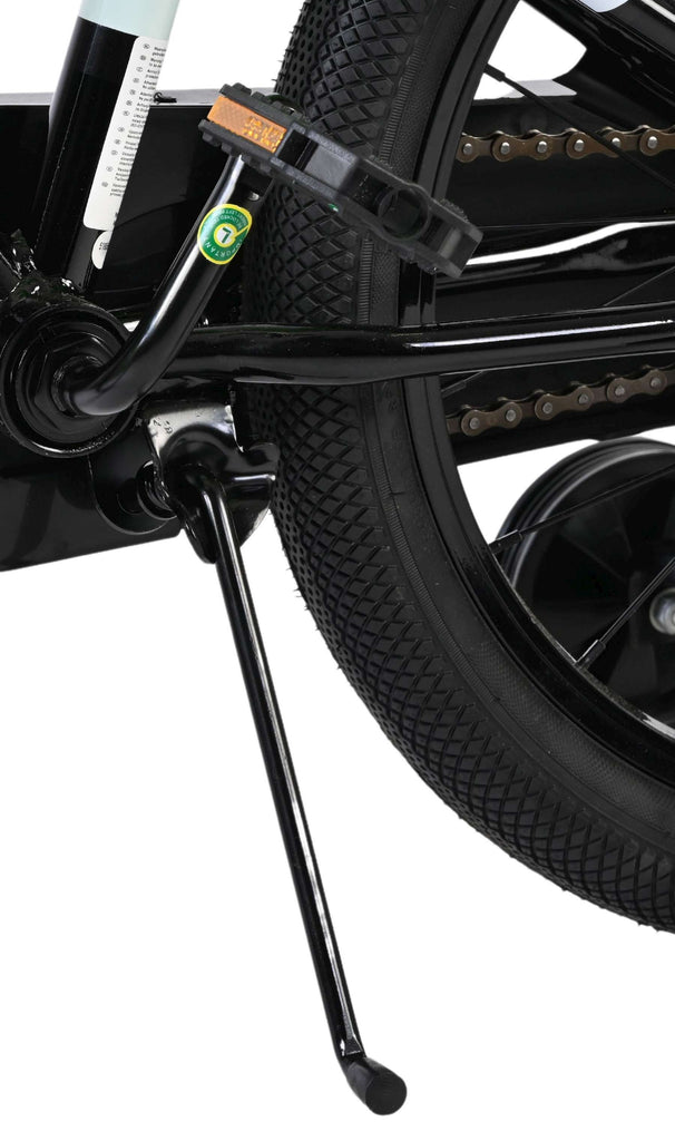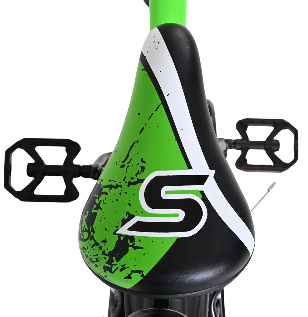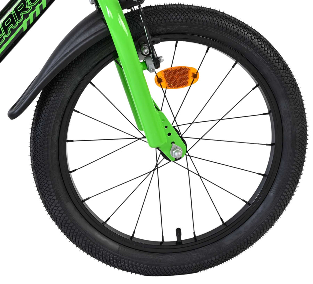 Veiligheid staat voorop! Daarom heeft deze gave fiets twee handremmen en geen terugtraprem! Het sterke stalen frame heeft met de stoere neon groen met zwarte kleurstelling een zeer sportieve uitstraling. Met de bidon in de praktische bidonhouder heeft uw kind altijd iets te drinken bij zich. De spatborden houden al het opspattend vuil tegen. Ter bescherming van de kleine vingertjes is de kettingkast gesloten. De fiets heeft zijwielen en een stevige standaard.