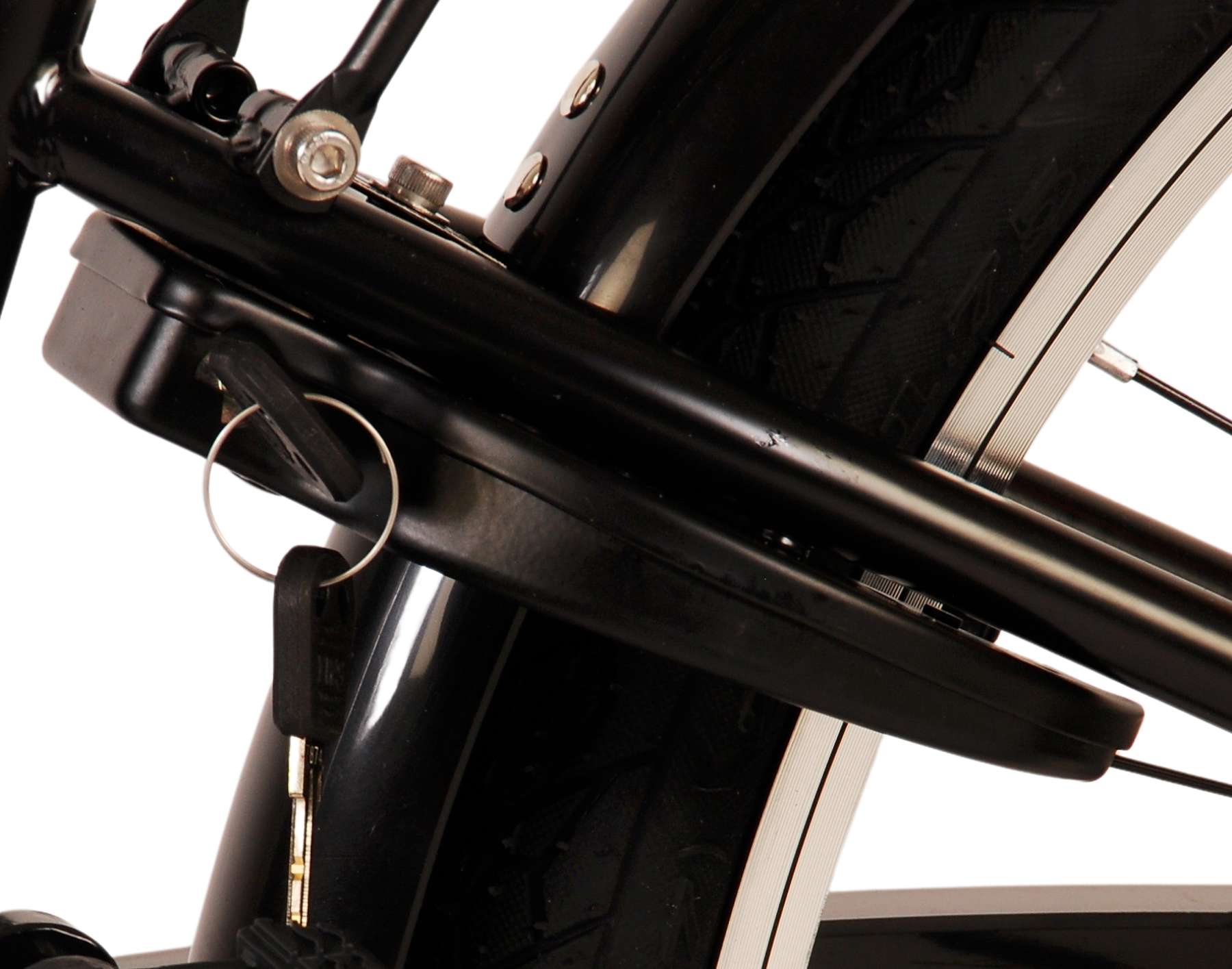 Veiligheid staat voorop! Daarom heeft deze gave fiets een handrem en terugtraprem en verlichting op batterij voor en achter. Daarnaast heeft de fiets een leuke bel en reflectoren in de wielen. Ook aan het comfort is gedacht. De mooie zwarte Volare fiets met blauwe accenten heeft een luxe zacht zadel en extra zachte handvaten, een handige achterdrager, en een stevig frame dat wel tegen een stootje kan. Verder heeft de fiets een standaard zodat hij netjes blijft staan en een sterk slot. Om zo lang mogelijk van de fiets te kunnen genieten heeft deze een extra lange zadelpen waardoor de fiets nóg langer met het kind meegroeit en ook het stuur is in hoogte verstelbaar.